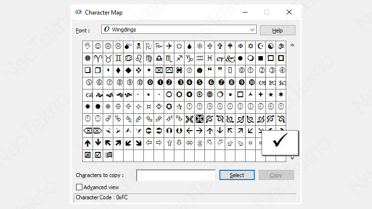 Ikuti langkah-langkah berikut ini untuk menampilkan tanda centang melalui program Character Map.